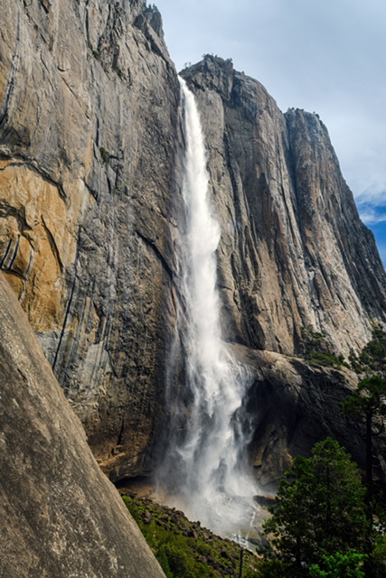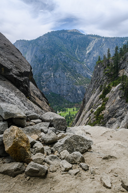 爬到Upper Falls顶上其实这个Trail就已经完成了70%。接下来有两个补水点:可以选择走0.2 mile到Yosemite Creek边上取水,或者继续往前大概1 mile到trail和Eagle Creek交汇点。Again今年积雪多所以到了八月Yosemite Creek依然水势凶猛,外加河道中的花岗岩经过水流抛光非常湿滑,取水的时候要相当小心。