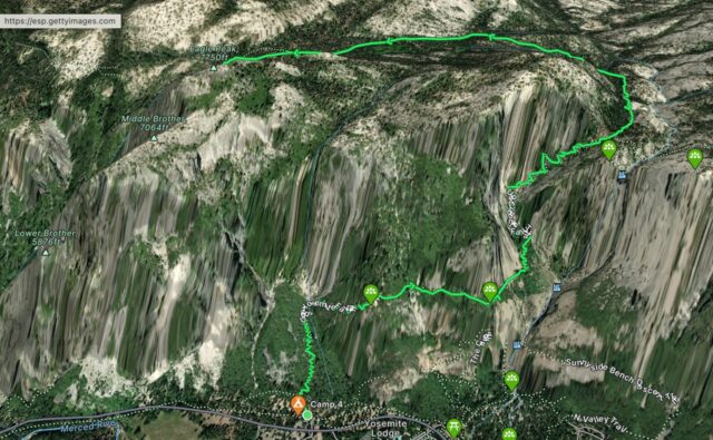 Eagle Peak是整个Yosemite Valley的最高点,也是Three Brothers的主峰,海拔大约7800 ft,在El Capitan东边大概2 mile。为什么要爬Eagle Peak呢?John Muir同志曾经说过,Eagle Peak有着“most comprehensive view of all”。因为这次有Wilderness Permit,所以初步计划是沿着Upper Yosemite Falls Trail爬上去,然后向西到Eagle Peak顶上camping一晚,第二天再下来。虽然总长也达到了14 mile + 爬升4000 ft,但因为可以过夜所以不用day hike就相对容易一些。但因为要背帐篷水和食物上去,以及Yosemite wilderness camping必须要携带bear canister装食物和垃圾,所以负重要比day hike Half Dome大很多。