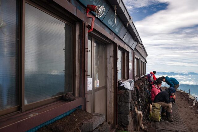 对于绝大多数人,第一天是从吉田口五合目爬到七合目到九合目之间,然后第二天凌晨三点前出发登顶看日出,因此吉田和须走口(二者在八合目以后merge)七合目到九合目之间的山屋是最难订的。山顶的山屋反而很容易订,我这次住的顶上富士馆(Chojo Fujikan)一月开始预定,我四月中旬发封信就能轻松订到七月周末的时间。另外需要注意每个山屋的预定方式不同,有些只支持电话预定,有些可以网上预定,有些写封email就行。