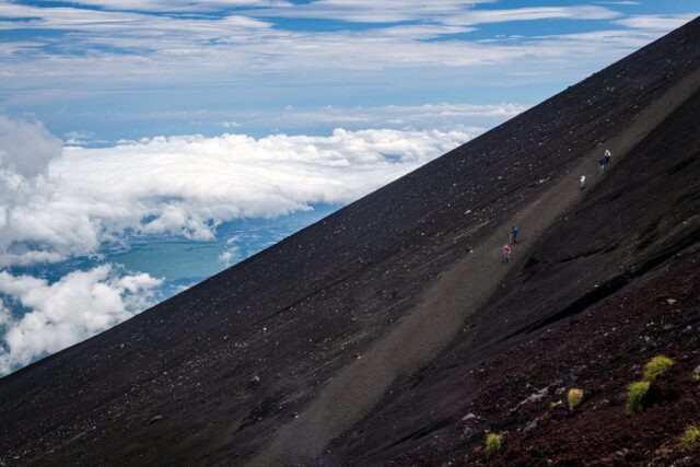大概六点开始沿着吉田Trail下山,因为风大一阵阵的砂石直接打在身上很痛,鼻孔耳朵了也被灌了不少砂石。这一段被称为砂走,基本上就是用推土机推出来的砂坡,很滑,所以绝大多数人都是迈小步往下走。其实这一段更省力的走法其实是像滑雪一样大步往下滑,用这个办法我只花了约一个多小时就到了吉田trail五合目,在这里遇到了好几队正开始爬山的幼儿园小朋友。