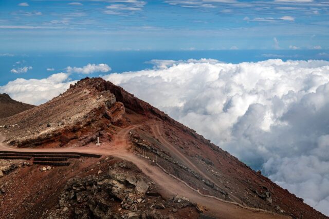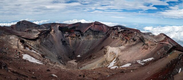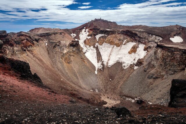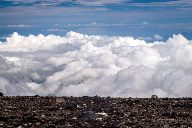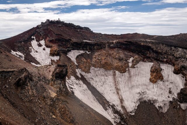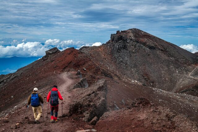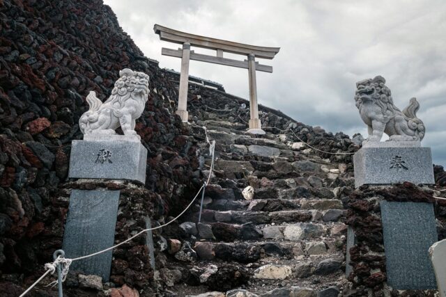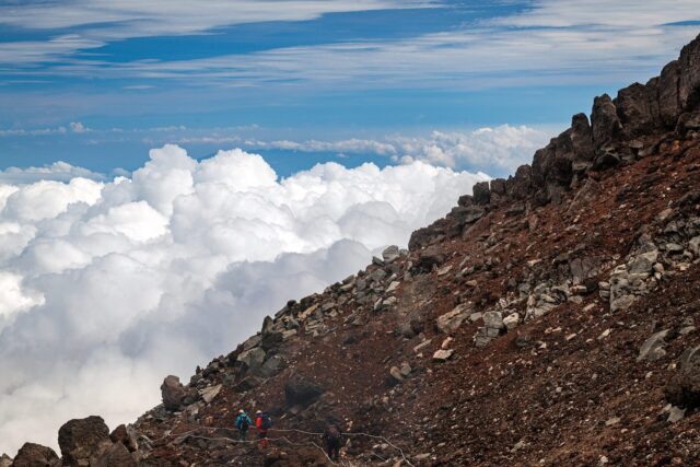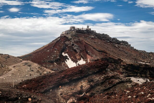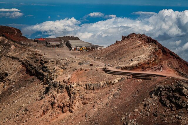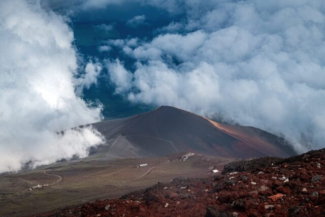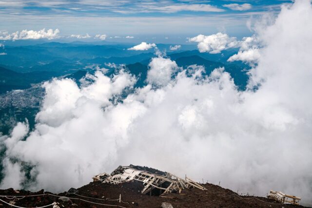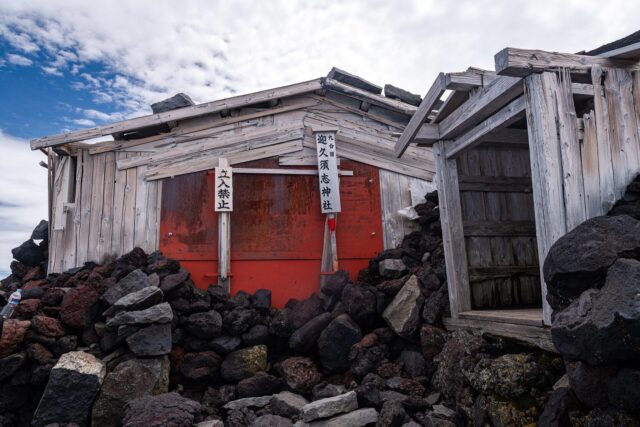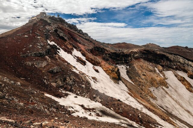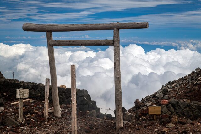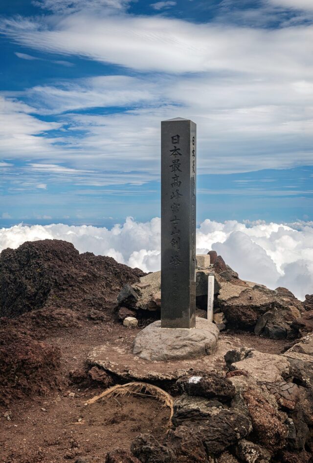 过了八合目以后温度明显下降,拿出羽绒服穿上,接下来只花了大概一个小时就到了山顶十合目鸟居,总共用了不到四小时。走到顶上富士馆发现下午四点才能check in,于是继续绕火山口的お鉢巡り(Ohachi-meguri),顺便登上日本最高峰剣ヶ峰(Kengamine)。