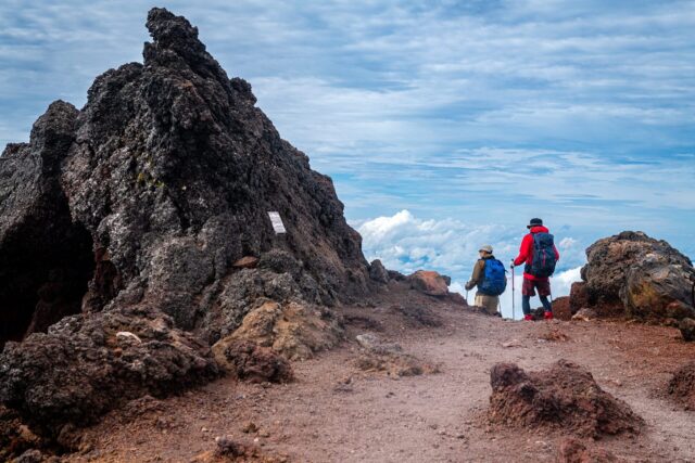 在山屋吃了一顿潦草的晚饭后晚上七点就熄灯了,晚上断断续续睡了三四个小时,到凌晨三点多就听到外边狂风如雷。四点钟灯亮,大家起床以后开始分发早餐,潦草吃完以后四点半开门,外边果然浓雾伴着狂风阵阵,日出是不用想了。因为风速过高,我一直等到快六点多才开始下山,中间有一段在火山口边上的风速感觉超过60 mph,别说站着了,连蹲着都会被吹走,只能摘掉眼镜一点点爬过去。