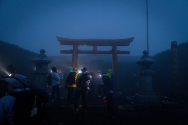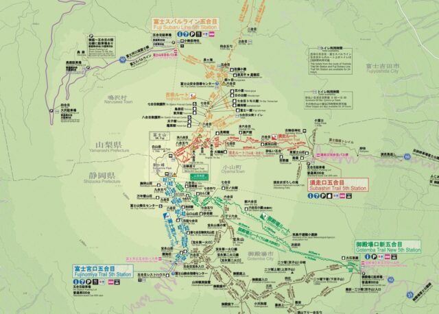 先稍微说几句准备工作。富士山有四条主要trail登顶:吉田(Yoshida),须走(Subashiri),御殿场(Gotemba),富士宫(Fujinomiya)。每个trail都被分成十个合目。江户时代登山往往从每个trail起点的富士浅间神社开始,骑马到马返(Umagaeshi)后步行前往山顶。自从上世纪公交车到达各trail的五合目后,五合目以下的trail逐渐荒废。各个trail上都有数量不等的山屋,可以上厕所,买东西,吃饭,住宿,避难,相当方便。