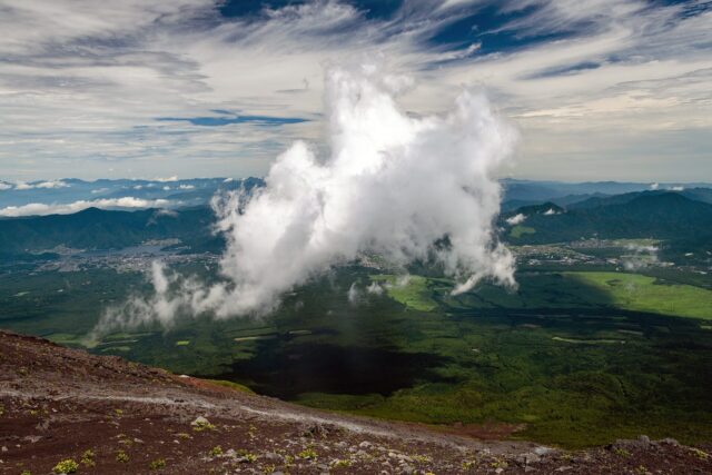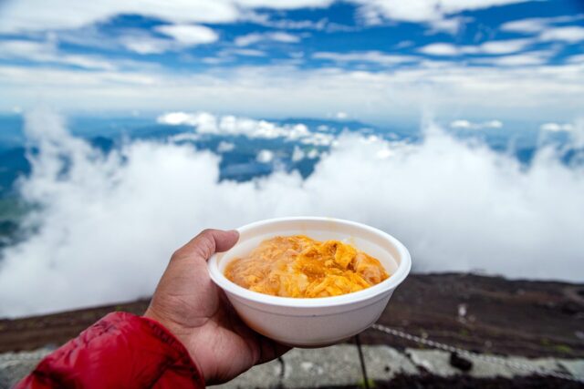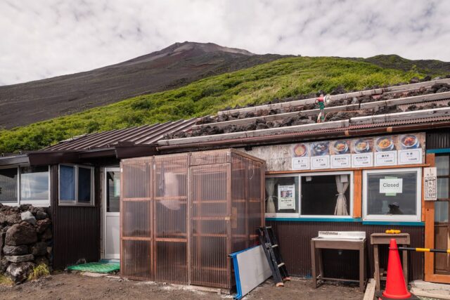 大约1小时后就到达须走口五合目,下车后扫描了之前静冈县登山注册的二维码,“捐赠”1000 yen给富士山保全基金并得到一样小纪念品。然后就开始埋头hiking。须走trail最开始的1 mile在森林中,有很多shade,之后随着海拔升高草木逐渐消失。进入七月以后台风降水增多,好在攀登当天天气相当不错,完全没有雨又不是很晒,只有过了七合目以后风略大。八合目之后须走和吉田trail会merge,因此会变得比较拥挤。我走得比较快,到八合目只花了大概两个半小时,于是就在江戸屋吃午饭,親子丼1200 yen价格很便宜。
