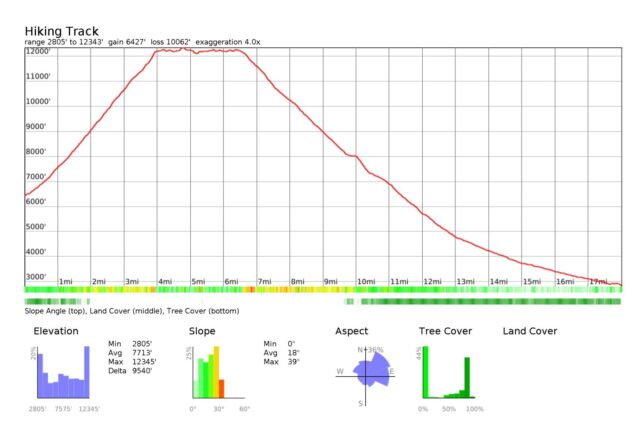 回来算了算,两天大概一共走了18 mile,上升6800 ft下降10000 ft,刚好画了一个富士山。