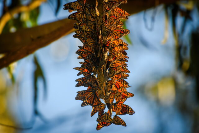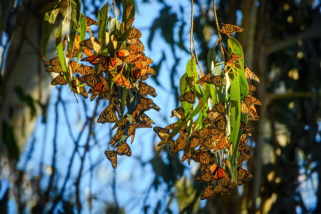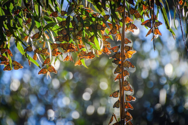 每年秋冬,成千上万的帝王蝶从北美大陆最南端的墨西哥迁徙至Santa Cruz的Natural Bridges State Beach,桉树林成了它们的冬日栖息地。这段漫长的旅程对帝王蝶来说是一场生死考验,而更神奇的是,它们的迁徙会跨越几代生命,每一代都承接上一代未竟的旅程。数千公里的迁徙中,只有第4或5代帝王蝶会飞抵加州越冬,而这些“长寿一代”的帝王蝶寿命可以达到6到8个月,专为冬季栖息而生。每到11月至次年2月,早晨或阳光微暖的时刻,大片蝶群在桉树间翩然起舞,宛如自然的奇迹在眼前展现。