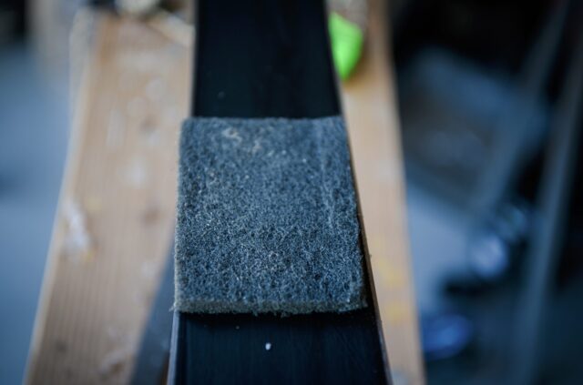 刷蜡:最后一步是用尼龙刷(或者硬洗碗布)在雪板底部刷出微小凹槽。同样,这一步一定也要沿着同一方向、从板头向板尾方向刷。如果这一步还能刷出很多蜡粉,那说明上一步蜡还没有刮干净,需要返回继续刮。