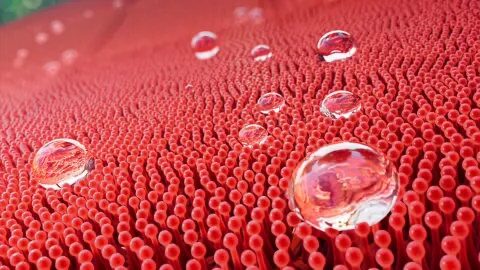 DWR利用的是表面张力原理——当衣物表面张力大于水的张力时,水就无法“润湿”面料,形成荷叶效应。但DWR并不持久,沾上油脂、灰尘、日晒后就失效。